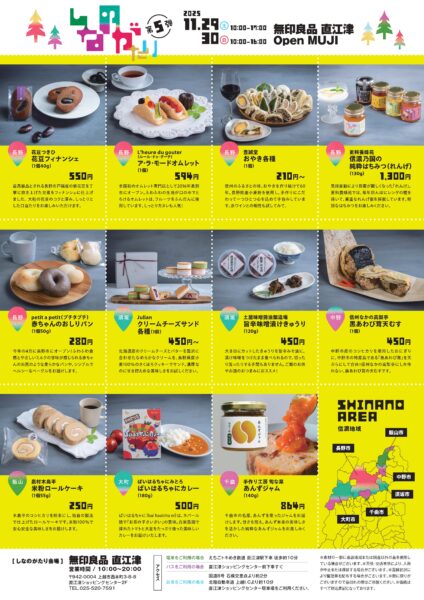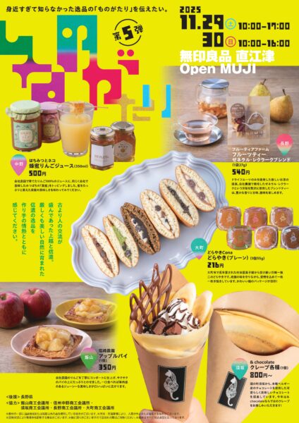 長野商工会議所では、飯山商工会議所、信州中野商工会議所、須坂商工会議所、大町商工会議所と共同で、11/29(土)~11/30(日)まで、無印良品直江津 Open MUJI スペースにて第5弾『しなのがたり』販売会を開催します。
