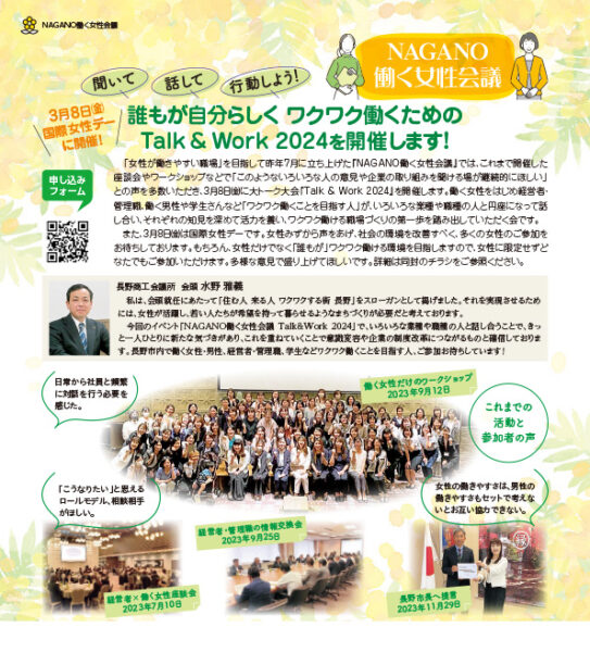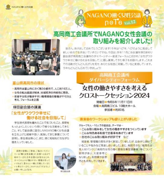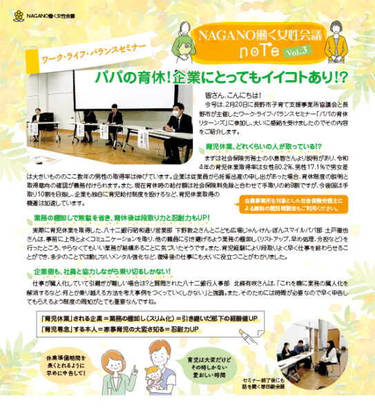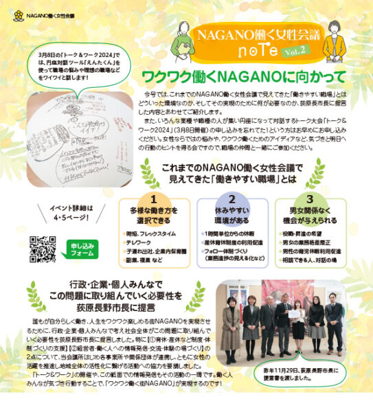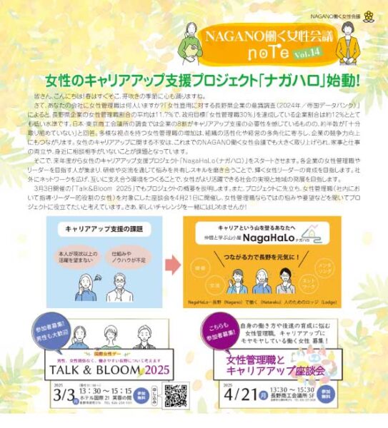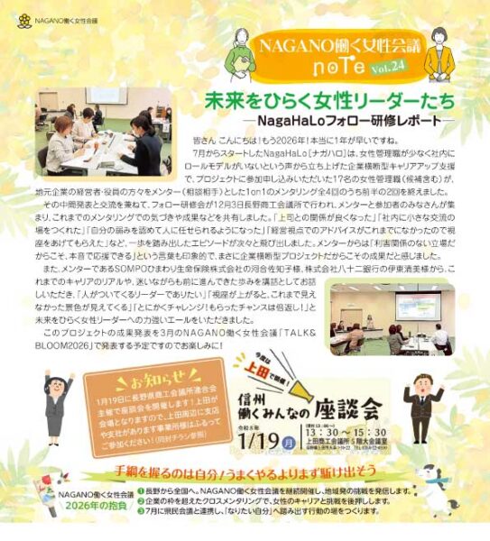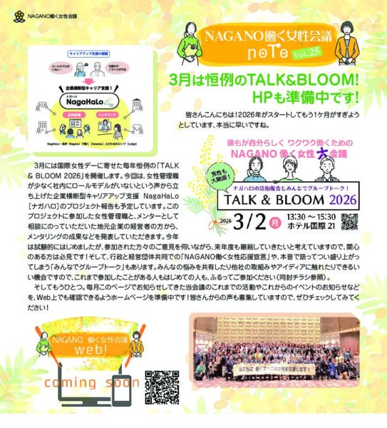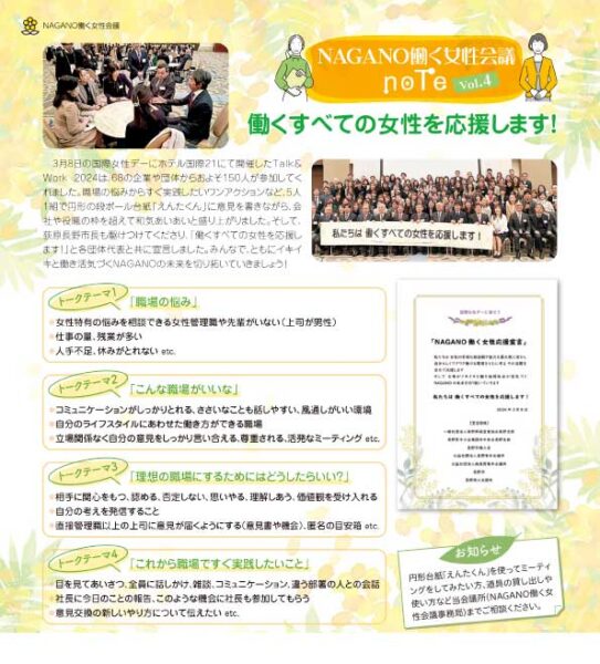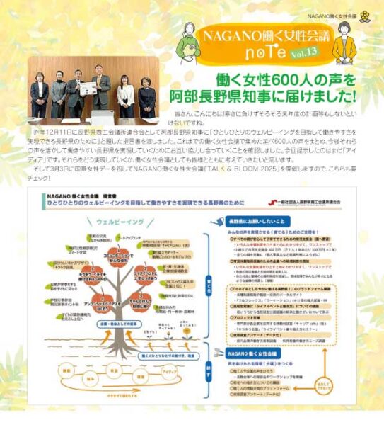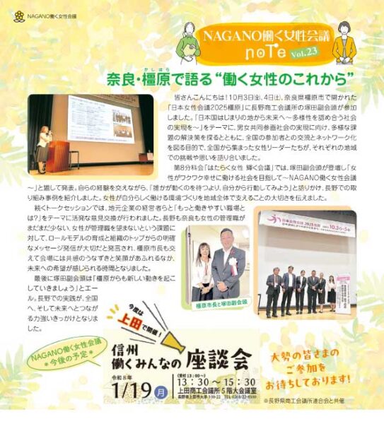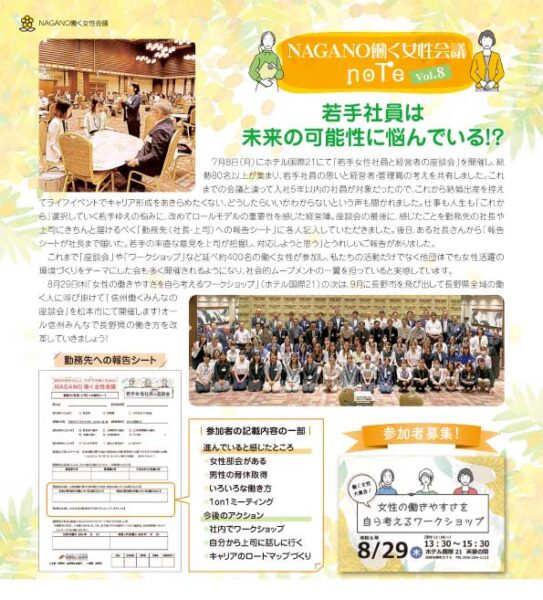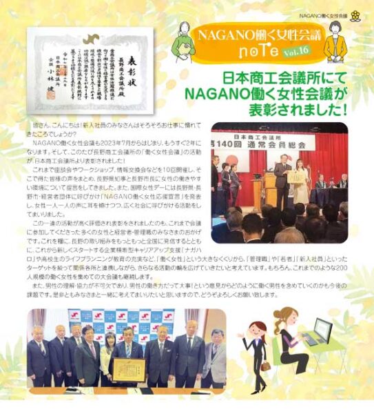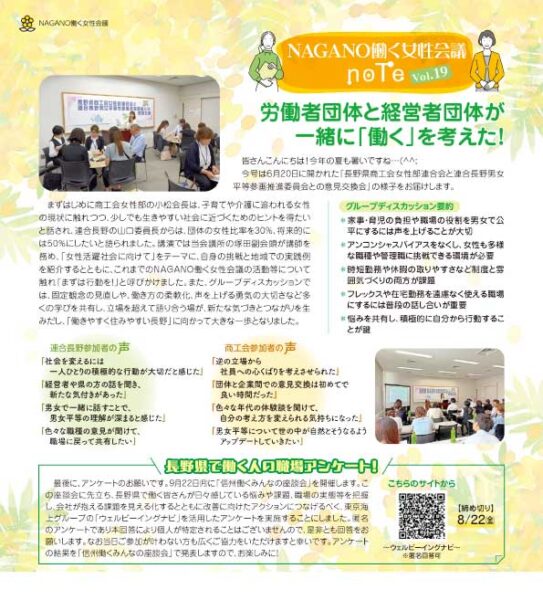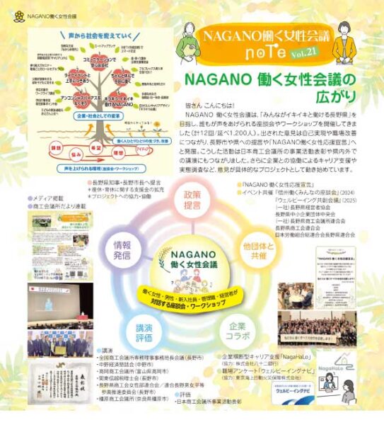 このサイトでは、働く女性会議の座談会やプロジェクトの情報を発信するとともに、これまでの活動を「NAGANO働く女性会議note」(長野商工会議所だより内コラム)で紹介しています。