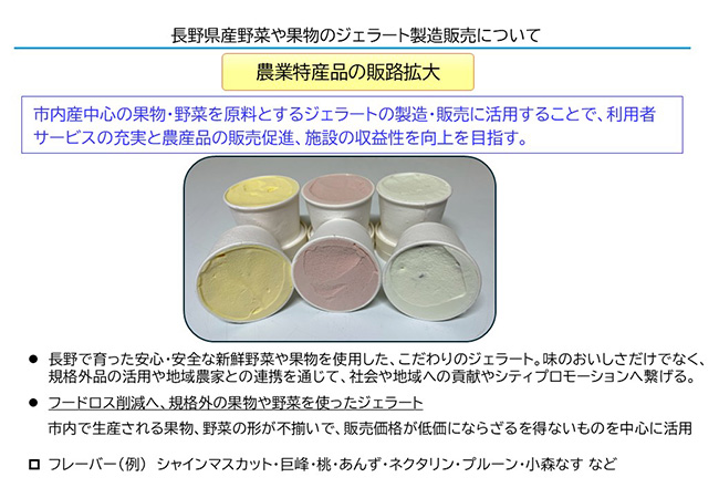 A-10 | 長野市農業祭実行委員会 | 市内産中心の農産物を使ったジェラート販売 | 長野市 | ・地域産野菜等のジェラート販売 ・六次産業化、農商工連携の好事例の紹介市内産中心の農産物を使ったジェラート販売一般社団法人 長野市開発公社小嶋 健太長野市 |