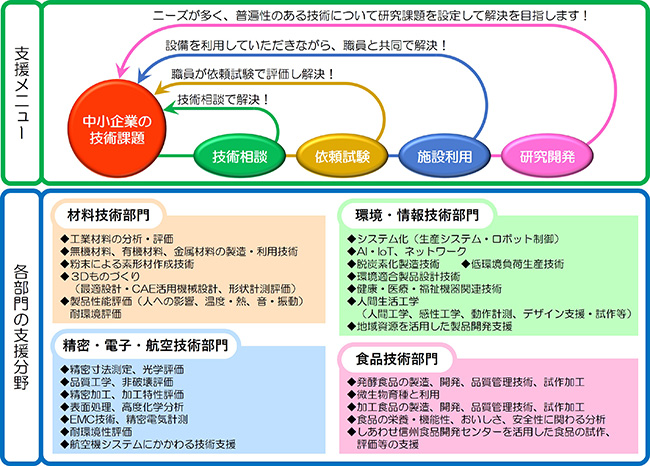 A-12 | 長野県工業技術総合センター | 支援事例(製品化、研究開発等)、設備の紹介 | 長野市 | 工業技術総合センターは、「材料技術部門」、「精密・電子・航空技術部門」、「環境・情報技術部門」、「食品技術部門」の4部門があり、県内中小製造業の技術力向上を支援しています。技術相談、依頼試験、施設利用、研究開発、人材育成、情報提供などを通じて、現場の課題解決をサポートしています。支援事例(製品化、研究開発等)、設備の紹介本展示では、食品技術部門による支援事例や研究成果を紹介します。製品開発や品質向上に向けた分析・試験の活用例を通じて、当センターの具体的な支援内容をご覧いただけます。技術支援に関心のある方はもちろん、情報収集や今後の参考にとお考えの方も歓迎です。センターの活動を知っていただく機会として、ぜひお気軽にお立ち寄りください。技術連携部門櫻井崇長野市若里1-18-1 |
