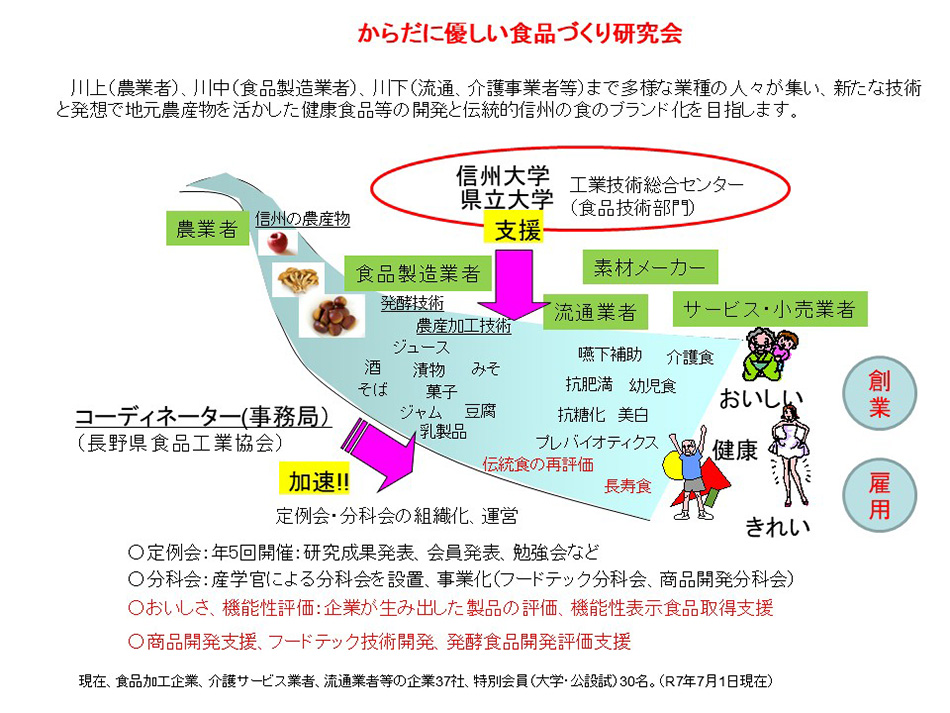 A-05 | (一社)長野県食品工業協会 | 産学官研究会成果品および会員企業製品 | 長野市 | 長野県の食品産業の振興をはかるため、食品の製造技術向上、品質向上及び安全確保、並びに地域の食資源の活用等の食品工業の総合的な施策を積極的に推進し、もって一般県民の食生活の安定化及び向上に寄与することを目的としています。産学官研究会成果品および会員企業製品信州大学、長野県および長野県下の食品関連企業からなる「からだに優しい食品づくり研究会」の活動紹介および食品工業協会会員企業、団体の新製品の展示等を行います。蟻川 幸彦長野市栗田西番場205-1 |