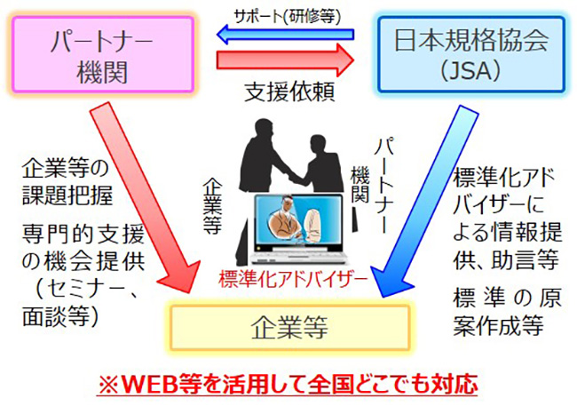 A-09 | (一財)日本規格協会 | 自社製品市場拡大等に標準化という選択肢があります! | 東京都 | 日本規格協会グループは、1945年の設立以来、「標準化および管理技術に関して、その開発、普及および啓発などを図り、もって社会経済の健全な発展と国民生活の向上に寄与する」という目的を達成するため、デジタル化、グローバル化、急速な高齢化等の変化に対応すべく、グループ全体の専門性を一層高め、ステークホルダーの皆様との連携強化を図りながら、標準化の相談から規格の作成、組織および要員の認証を含む規格の活用支援に至るまで、標準化と品質管理に係るトータルソリューションの提供という社会的使命を果たしております。自社製品市場拡大等に標準化という選択肢があります!標準化とは、ある製品やサービス等に対して、利害関係者との間で任意の「決め事」を開発し、普及させる取組です。例えば、自社の製品・サービスの質の高さを適切に評価できる試験方法をJISとして標準化ができれば、業界全体で同じJIS(モノサシ)で、その製品等の質を評価できるようになるため、自社の優位性をアピールしやすくなります。新製品開発における付加価値向上や製品の効果的なPR等に取り組む有効な手段として、ぜひ標準化の活用をご検討ください。自社製品の売上・市場拡大のために標準化という選択肢があります!スタンダード・コンサルティングセンター 標準化企画調査チーム岩田良夫東京都港区三田3-11-28 三田Avantiビル7階 |