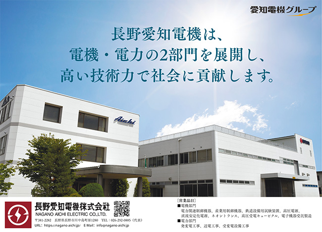 B-16 | 長野愛知電機(株) | 当社事業内容の紹介・展示 | 長野市 | 電機部門 お客様の企画を開発から量産まで徹底サポート 設計開発から資材調達、製造、検査までの一貫した生産体制から生まれる高い品質の製品の提供で、お客様のものづくりをサポートいたします。 電力部門 明日へ、未来へ。“電力の安定供給”をサポート ライフラインとして重要な使命を担い、クリーンかつ快適な生活空間を支える電力。送電線の建設工事・発電所の新設、改修・拡充工事、機器メンテナンス等に取組み、生活の基盤である電力の安定供給をサポートし、今後も良質な電力の安定供給・地域の発展に貢献します。当社事業内容の紹介・展示長野市川中島町原1280 |