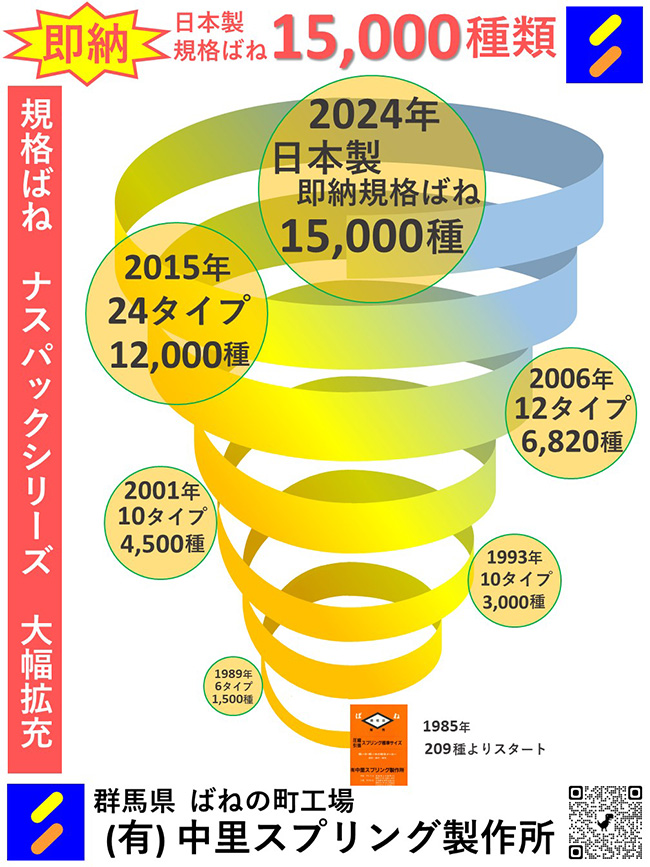B-37 | (有)中里スプリング製作所 | 日本製即納ばね【ナスパックシリーズ】15,000種 | 群馬県 | (有)中里スプリング製作所は、微量多品種の日本製ばねを生産しています。 ■インコネル・タングステン・モリブデン・チタン等の特殊材にも対応しております。 ■【ナスパックシリーズ】15,000種は、日本製の即納規格ばねで、一部を除き当日発送です。緊急時や試作開発などに役立てていただけます。 ■【NoCO²】(ノココ)420種は、電気を使わずに製作しているBCP及びSDGs対応規格ばねです。 ■【ばね鋼房】ばね生産で出る端材を、視点を変え素材として生かした、ワイヤーアート製品が多数あります。日本製即納ばね【ナスパックシリーズ】15,000種・【ナスパックシリーズ】2024年4月15,000種に拡充。昭和60年より規格化を開始した開発・設計で役立つ、日本製自社規格ばね。一部を除き即納体制。 ・【NoCO²】(ノココ)420種は、防災士監修のもと完成した、BCP及びSDGsにも対応している電気未使用で製作するばねです。 ・【ばね鋼房】製造の過程で出る端材を、視点を変え素材として生かしたワイヤーアート製品です。 ・特急品対応製品 最短実績25分~ ・通常生産製品 1個~800万個甘楽工場中里 保史群馬県高崎市上中居町315 |