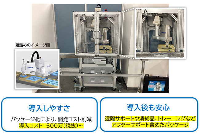 B-41 | (株)フレアオリジナル / エプソン販売(株) | 製造業様向け「箱詰め工程の自動化」ソリューション等 | 坂城町 | エプソン販売は「環境」「DX」「省人化」を起点にエプソンのソリューションや商品、サービスでお客様の課題を解決いたします。製造業様向け「箱詰め工程の自動化」ソリューション等エプソンは自社製品の製造現場で培った自動化ノウハウやナレッジを基に、ロボット制御技術を生かして製造業の皆様の自動化を支援し、人手不足への対応、労働生産性向上を実現することで、社会課題解決に貢献いたします。坂城町 |