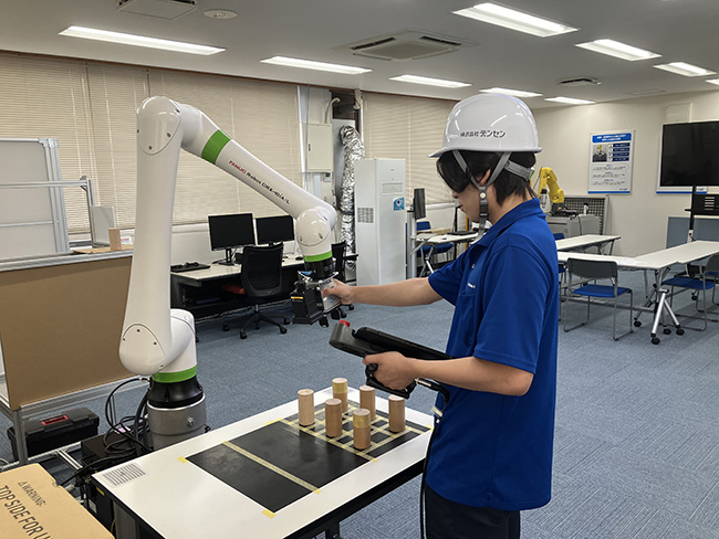 B-08 | (株)デンセン | 人手不足の課題解決!協働ロボットのプログラム体験 | 長野市 | デンセンは電気を核とした商品、サービス、技術の提供によって快適な社会環境の創造を目指す総合商社。電設資材を中心にFA機器やロボット、脱炭素商材、介護用品等、様々な商材を取り扱っています。お客様に寄り添うご提案で地域産業の発展に寄与し、豊かな暮らしのお手伝いをさせて頂いています。若手社員が多く存在し活気のある会社です。働き易い環境整備を積極的に行い、社員が安心して長く働ける環境を提供しています。また、人材育成にも注力し、社内研修により全社員が社長方針を理解し、各々が志を備えて行動しています。人手不足の課題解決!協働ロボットのプログラム体験ファナックCRXロボットを使ってマシンテンディングをイメージ出来るデモを実演。省人化省力化に向け、安全性の高い協働ロボットを身近に感じて頂ける機会です。アイコンによる直感なプログラム(教示)や、高速立上げを可能にするOnRobot製ハンド。DXに繋がるデータ統合ソフトウェア「IoT Data Share」をプラットフォームに、カイゼン箇所を簡単に抽出出来る「スグラフ」を使えばエネルギーデータ分析アプリの手軽さをご体感出来、エネルギー監視やCO²排出量、消費電力等どんなデータでも見える化を実現。Siソリューション事業本部木藤智也長野県長野市長池713-1 |