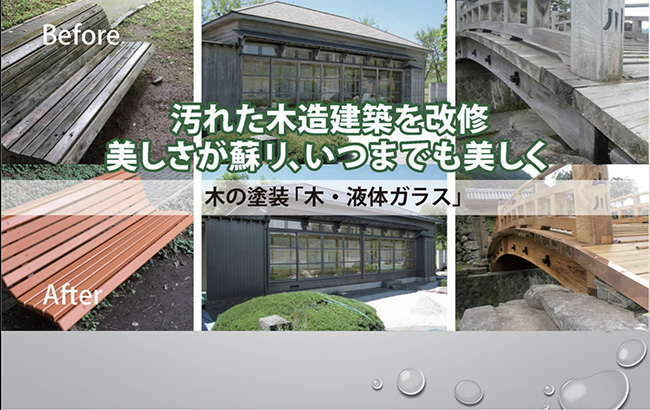 C-13 | (株)明石 | 液体ガラス施工及び施工提案 | 飯山市 | 液体ガラスの施工及び施工企画提案 サウナやウッドデッキの液体ガラスコーティング施工及び提案 自動車全般の液体ガラスコーティング施工及び提案 古い仏壇のリメイク及びリメイク企画提案 寺院用納骨団の販売及び将来寺院運営の企画提案液体ガラス施工及び施工提案防水性と防虫性に優れた液体ガラスのコーティングを長野県で提案しています 木材やコンクリート、紙や自動車など、幅広い素材に塗布できるコーティング剤を長野県で取り扱っており、強靭な耐久性を発揮しながらも、素材本来の質感や香りを感じられる仕上がりを提供いたします。特に木材に使用すると腐食やシロアリによる被害を抑える効果が期待されるため、お住まいの新築やリフォーム時におすすめで、木の温もりと美しさはそのままにしながら、耐久性を高められます。液体ガラス事業部明石洋一飯山市 |