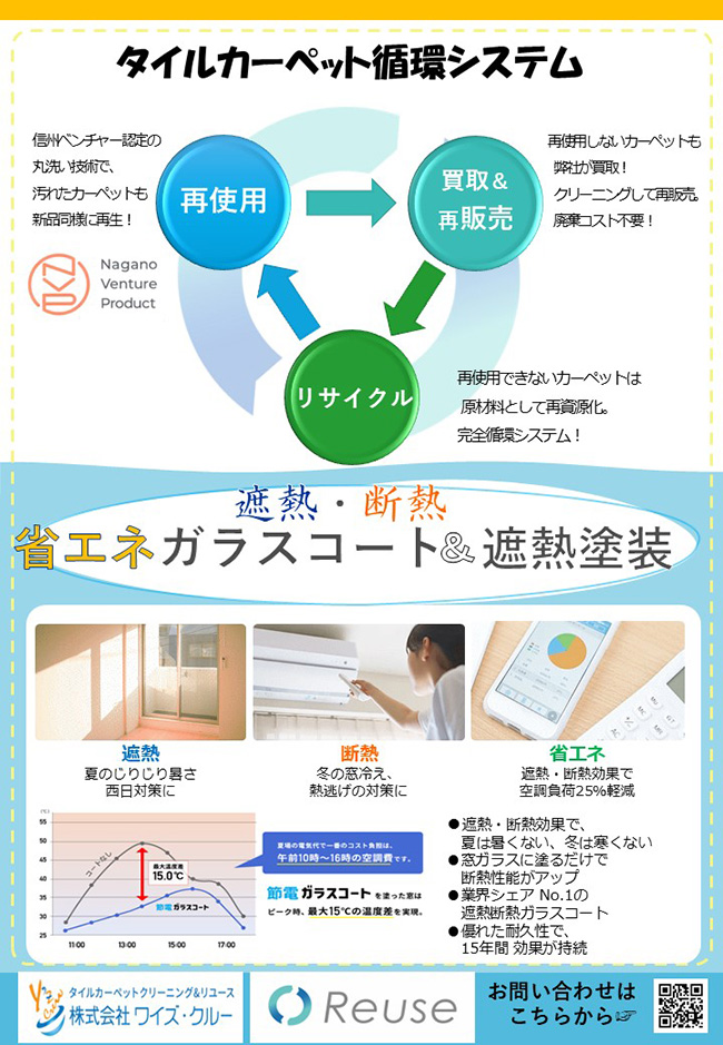 C-15 | (株)ワイズ・クルー | タイルカーペットの循環システム/省エネガラスコート | 上田市 | 業歴35年の環境配慮型ビルメンテナンスを母体としております。特に従来の工法で改善できないタイルカーペットの汚れを、従来にない画期的な方法で新品のように蘇らせ再使用が可能になります。また不用な場合は買取りクリーニング後、コストパフォーマンスに優れたリユースカーペットとして再販しています。更に摩耗が酷く再使用できないカーペットは、100%リサイクル処理し再資源化を行います。タイルカーペットの循環システム/省エネガラスコートタイルカーペットのリユース&リサイクルの方法により、ゴミがゼロになり、コスト削減にも環境にもやさしいタイルカーペットの循環システムです。 省エネガラスコートは、ガラスに塗るだけで断熱性能がアップ出来、節電効果にも繋がる業界シェアNO.1の遮熱断熱ガラスコートです。代表取締役社長仁科 剛長野県上田市古里1576-5 |