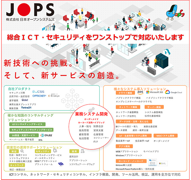 D-04 | (株)日本オープンシステムズ | 総合ICTサービス、セキュリティ、クラウドサービス | 長野市 | 私たちはICTに関連する一連のサービスを独自に提供しています。 ①インフラ構築 オンプレミス、クラウド(AWS、Azure、GCP) ②システム開発 カスタムメイド、ツールを用いた開発 ③システム検証 第三者による検証、自動化検査の支援 ④セキュリティ対策 フィッシングメール対策訓練、各種セキュリティ診断、コンサルティング ⑤運用支援 運用設計、標準化、運用管理総合ICTサービス、セキュリティ、クラウドサービス企画からネットワーク、システム開発、セキュリティ、検証テスト、自動化支援、運用・保守に至るまで、弊社は一貫して独自の対応を致します。 出展は弊社サービスの一端に過ぎませんが、日常的にICTに関する課題を抱える皆さまに、最適な提案と支援を提供する機会となることを願っています。 ・不要なシステムは強引に導入しません。 ・存在しないものは創造すればいい。 皆さまにとって真に必要なシステムを共に考えるお手伝いをさせていただきます。長野営業部清水 裕二長野県長野市七瀬3番2イーストゲート長野6F |