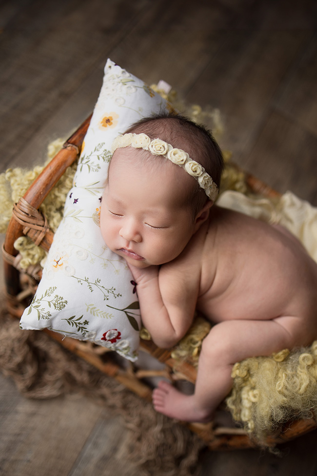 生後間もない新生児の赤ちゃんを撮影する「ニューボーンフォト」。心地よい深い眠りに導き、新生児の柔らかさや特徴を活かし、赤ちゃんを最高に可愛く美しく魅せるポージングを行い撮影します。撮影には特殊な技術が必要で、撮影後はアートに仕上げるレタッチを施すことで完成します。